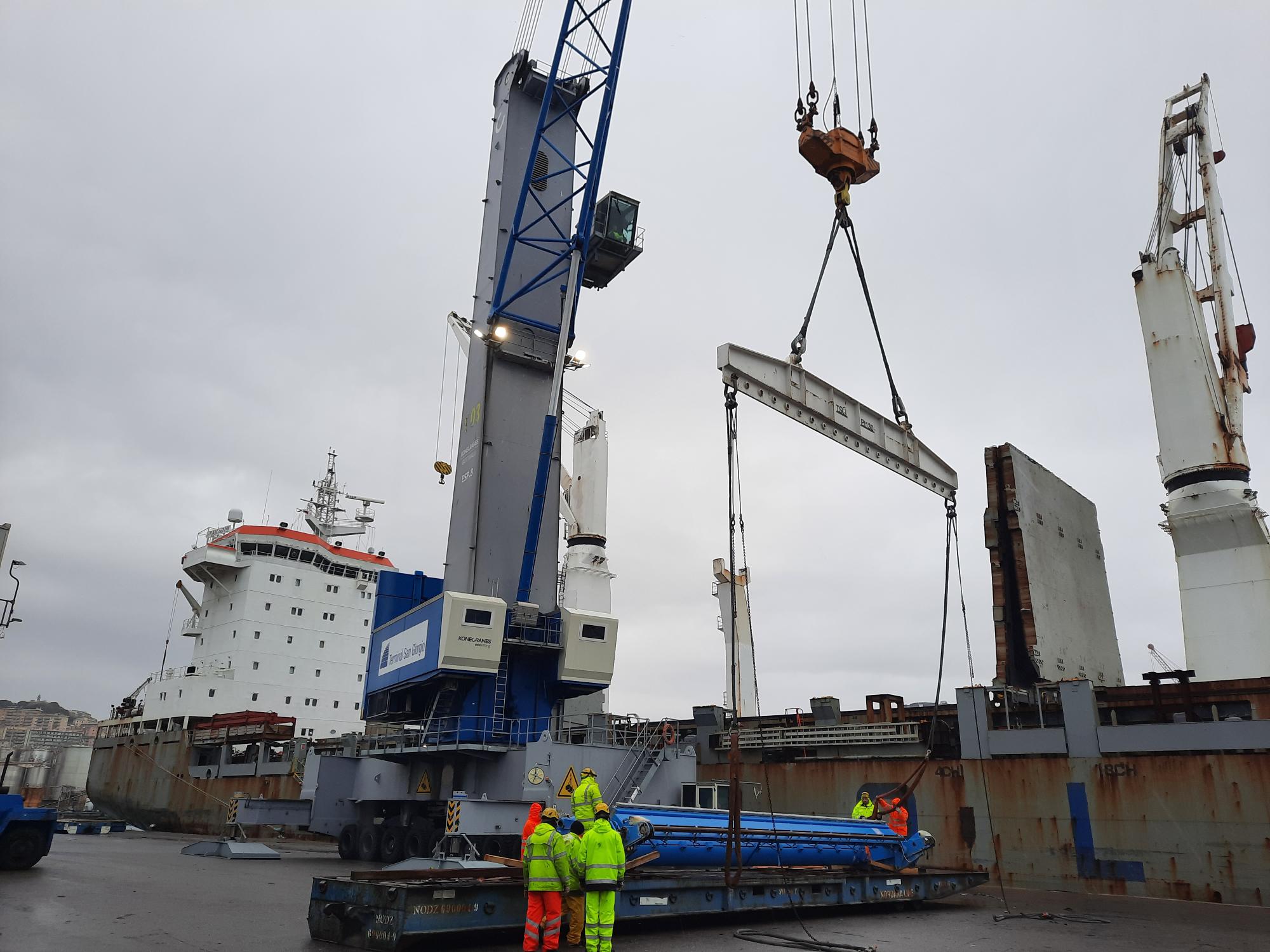 In vista dell’arrivo della nave, tutta la merce era stata stoccate dal terminal su mafi-trailer-platform ad alta portata, equipment specifico per assolvere alle peculiari esigenze di stoccaggio della merce heavy lift, in combinazione con la flessibilità di movimentazione resa possibile trainando le piattaforme all’interno delle aree di stoccaggio.